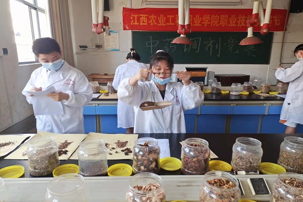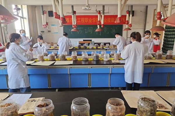 |  5月17日下午,2022年学院职业教育活动月暨第五届职业技能竞赛节“中药调剂”比赛在实训楼一305举行。中医药学院中药学相关专业共24位选手参加了此次比赛。 “中药调剂”为个人赛,24位选手分三批,通过抽签决定比赛场次及工位号。比赛参照全国职业院校技能大赛中药传统技能竞赛内容,结合我院实际设计。比赛内容为处方调剂,采用无药斗抓药方式进行,即处方中药分别装在不注药名的药盒内,随机摆放在工作台正前方。参赛选手在15分钟内按处方内容调配3付中药,要求调配操作规范,剂量准确,不撒、不漏,脚注处理合理,包装美观牢固、整齐规范。 比赛现场组织有序,裁判评判公平公正,选手操作娴熟认真。 本次中药调剂技能比赛,为师生搭建了交流与学习的平台,提高了学生中药调剂操作技能水平,展示了我院教师教学成果及师生良好精神面貌。