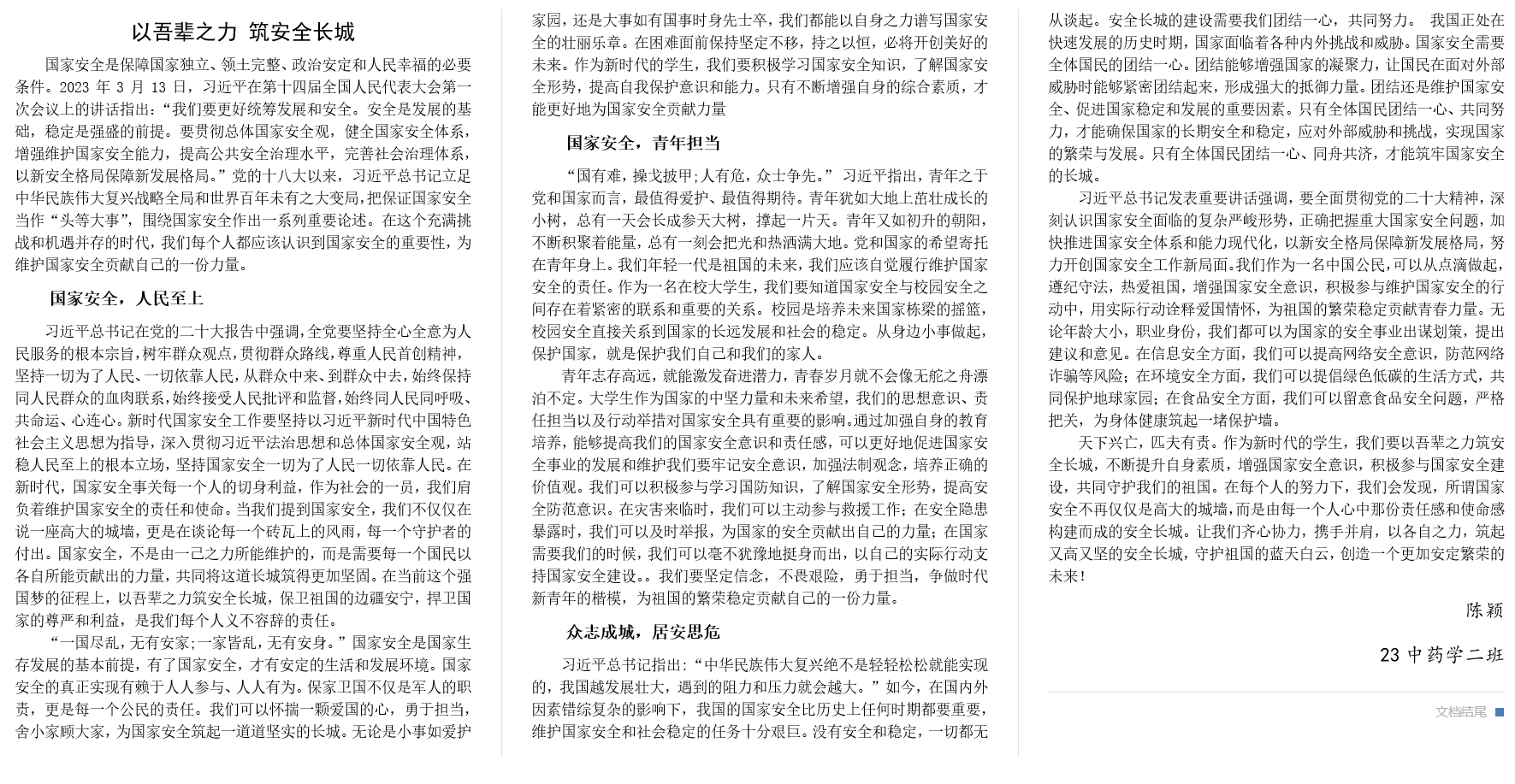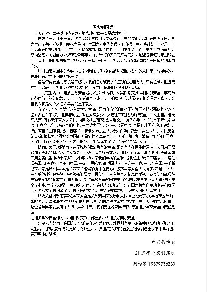 为深入贯彻习近平总书记关于加强国家安全教育的重要指示批示要求,树立师生人人都是国家安全卫士的理念。中医药学院于3月18日开展“新时代学校国家安全”主题征文活动。